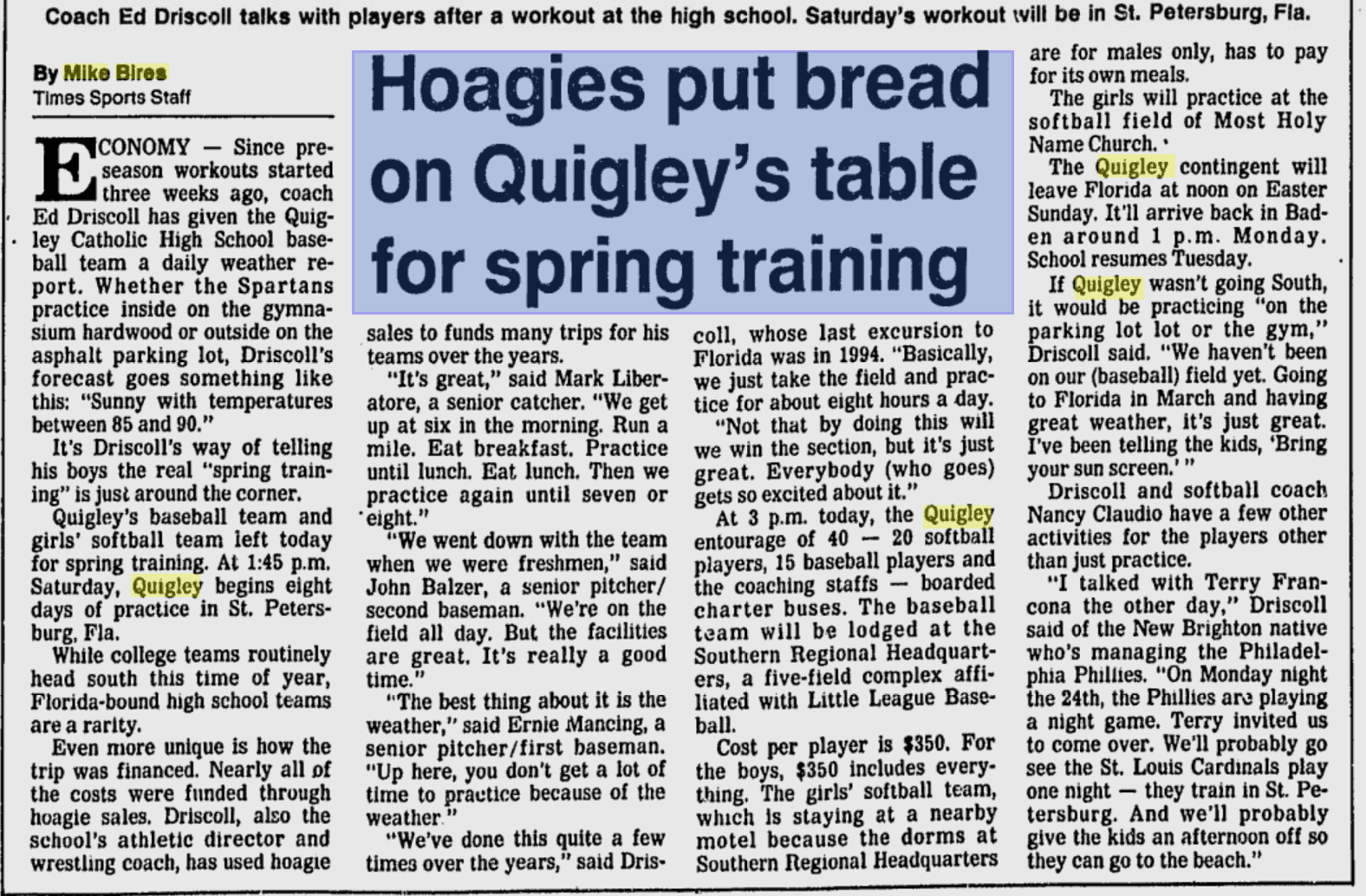 about Quigley’s Driscoll has baseball team selling Hoagies